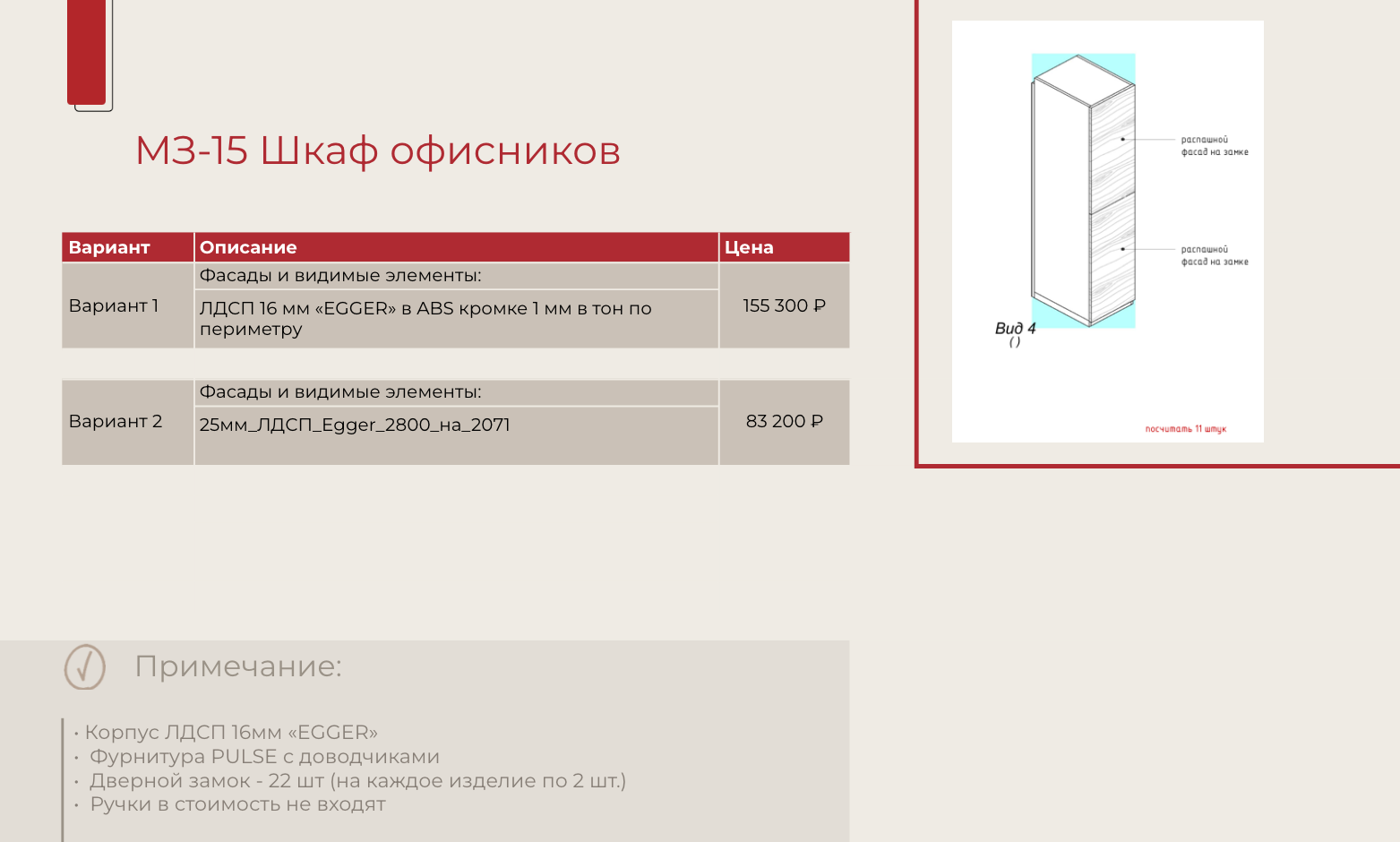 - Содержат характеристики предметов мебели, примечания к расчёту, данные о материалах корпуса и фасадов, фурнитуре и других компонентах. Это обеспечивает детальный и точный расчёт каждого изделия.